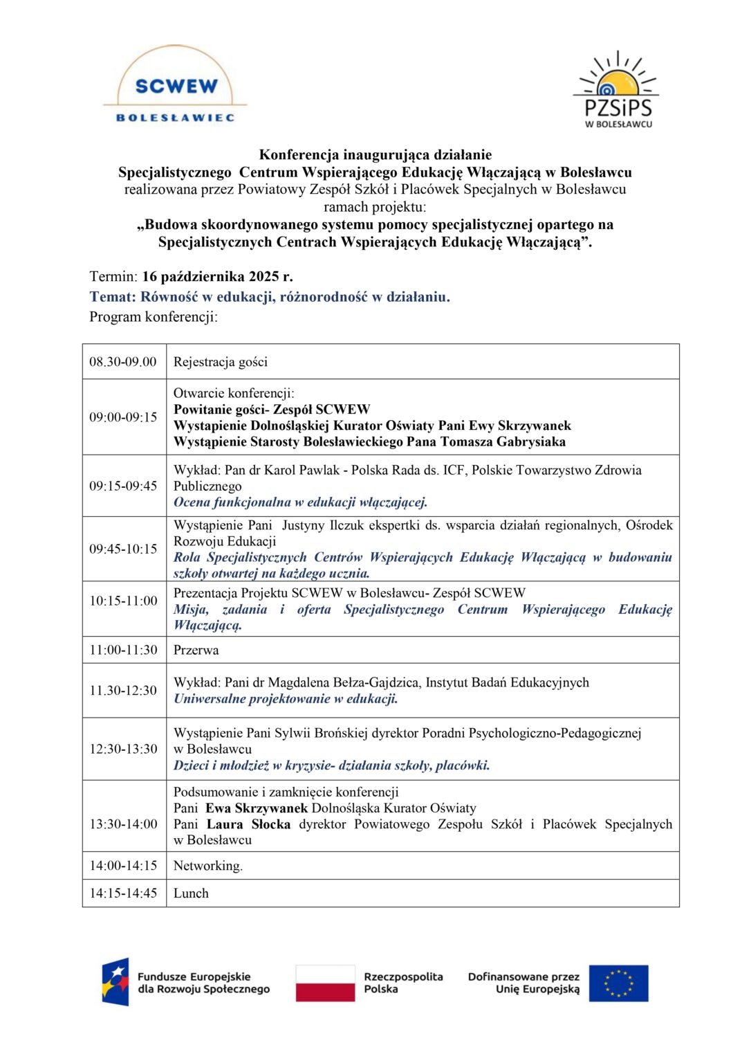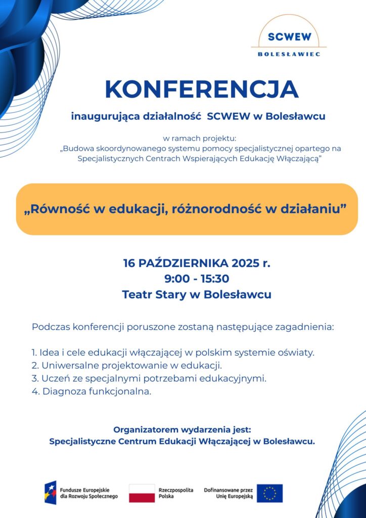 Dnia 16.10.2025 r. odbyła konferencja inaugurująca działalność Specjalistycznego Centrum Wspierania Edukacji Włączającej w Bolesławcu, która stanowiła ważny moment w budowaniu nowej jakości edukacji środowisku edukacyjnym. W spotkaniu wzięło udział 100 osób, przedstawicieli szkół, przedszkoli, instytucji wspierających, samorządu oraz specjalistów, których wspólnym celem jest tworzenie edukacji dostępnej i przyjaznej dla każdego ucznia.
